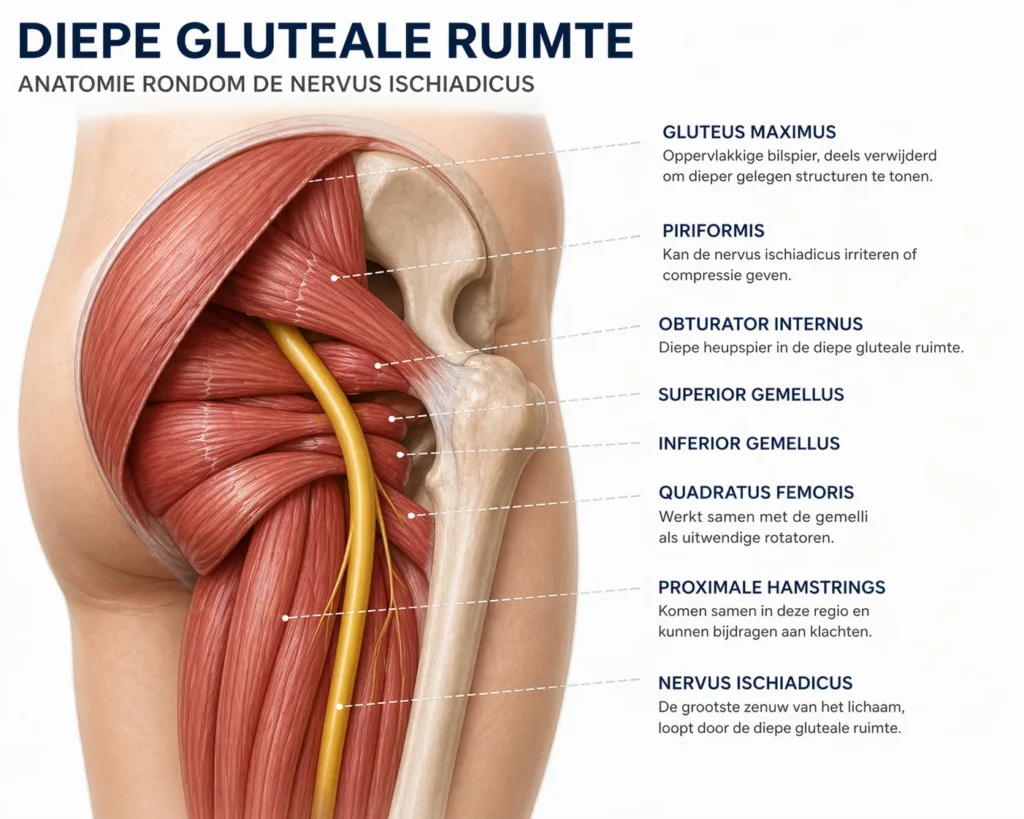Om te begrijpen waarom deze naamsverandering zo belangrijk is, moeten we stilstaan bij wat er zich afspeelt in de diepe gluteale ruimte. Dit is de anatomische regio diep in de bil, achter het heupgewricht, waar de nervus ischiadicus zijn weg moet zien te vinden door een gebied vol verschillende structuren.